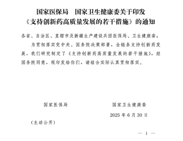據(jù)國(guó)家醫(yī)保局網(wǎng)站消息,國(guó)家醫(yī)保局、國(guó)家衛(wèi)生健康委6月30日印發(fā)《支持創(chuàng)新藥高質(zhì)量發(fā)展的若干措施》。其中提到,加大創(chuàng)新藥研發(fā)支持力度,支持創(chuàng)新藥進(jìn)入基本醫(yī)保藥品目錄和商業(yè)健康保險(xiǎn)創(chuàng)新藥品目錄,支持創(chuàng)新藥臨床應(yīng)用,提高創(chuàng)新藥多元支付能力。