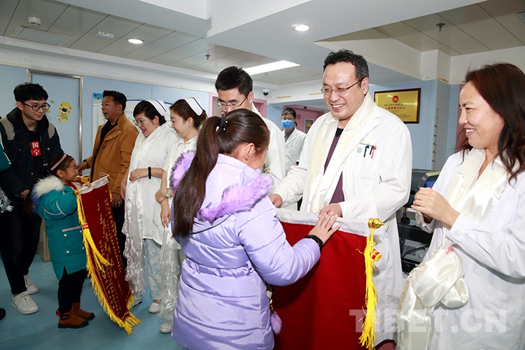 返鄉(xiāng)前,洛桑曲宗和次旦德吉在親屬和小學(xué)校長(zhǎng)的帶領(lǐng)下來(lái)到兒研所,向醫(yī)護(hù)人員和共鑄中國(guó)心組委會(huì)的工作人員獻(xiàn)上了哈達(dá)和錦旗,表達(dá)感激之情。醫(yī)護(hù)人員也向兩個(gè)孩子贈(zèng)送了書(shū)包等文具,鼓勵(lì)他們回校后好好學(xué)習(xí)。