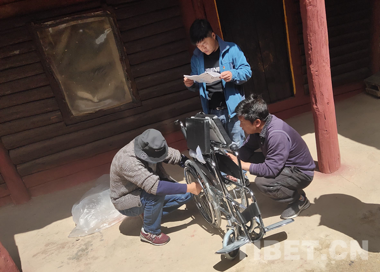 圖為工作人員在幫助受捐者組裝、調(diào)試輪椅