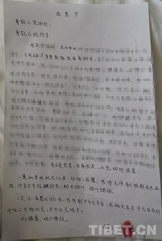 住院期間,索南吉的身份就是病人,對這個未知的疾病難免害怕,好的和不好的結(jié)局,她都反復(fù)想到了。作為一名參加過2003年非典和2010年甘肅舟曲特大泥石流一線救治工作的醫(yī)務(wù)工作者、有13年黨齡的共產(chǎn)黨員,她在住院的第2天,便向護士借來了筆和紙,在床頭向醫(yī)院鄭重寫下了請愿書:“一是如果我配合治療,戰(zhàn)勝了病魔,我將無償捐獻自己(的)血清,供醫(yī)療實驗研究。二是萬一病魔打倒了我,我將獻出自己身體,供相關(guān)醫(yī)療單位(開展)具有針對性的實驗研究,盡早攻克(新冠肺炎治療的)難關(guān)。”