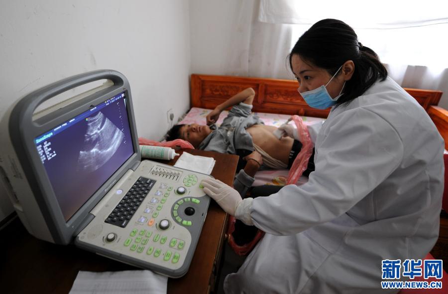 安徽省援藏醫(yī)療人員在西藏山南市錯(cuò)那縣勒門巴民族鄉(xiāng)為村民采用B超檢查腹腔,進(jìn)行包蟲病篩查(2017年8月7日攝)。新華社記者晉美多吉 攝
