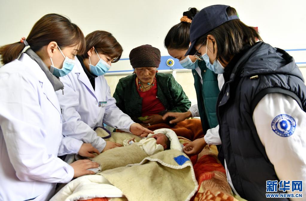 4月21日,在聶拉木縣人民醫(yī)院,山東省煙臺(tái)市第五批援藏醫(yī)療隊(duì)隊(duì)長(zhǎng)魏德賢(左二)、護(hù)士長(zhǎng)崔雯(左一)和當(dāng)?shù)蒯t(yī)院婦產(chǎn)科主任邊巴普尺(右二)、婦產(chǎn)科醫(yī)生扎桑德吉(右一)查房。新華社記者 張汝鋒 攝