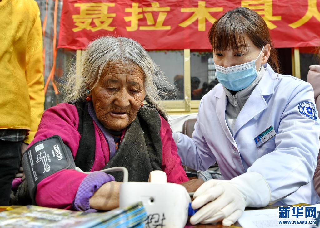 4月20日,山東省煙臺(tái)市第五批援藏醫(yī)療隊(duì)成員崔雯(右)為亞來(lái)鄉(xiāng)歐熱村村民測(cè)量血壓。新華社記者 張汝鋒 攝