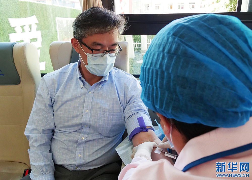 5月27日,來(lái)自北京協(xié)和醫(yī)院的援藏專家楊筱在獻(xiàn)血。(新華網(wǎng) 旦增努布攝)