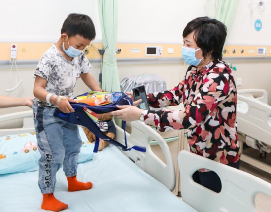 鄧?yán)蚋敝魅我恍锌赐藖碛逯委煹?5位患兒,并為他們送上嶄新的書包和文具。并與患兒家長熱情交談,詳細(xì)了解患兒恢復(fù)情況?;純杭覍俅碜楷敽屯贩謩e向重慶市衛(wèi)健委和重醫(yī)附屬兒童醫(yī)院贈送了錦旗,并獻(xiàn)上了潔白的哈達(dá)表示感謝。