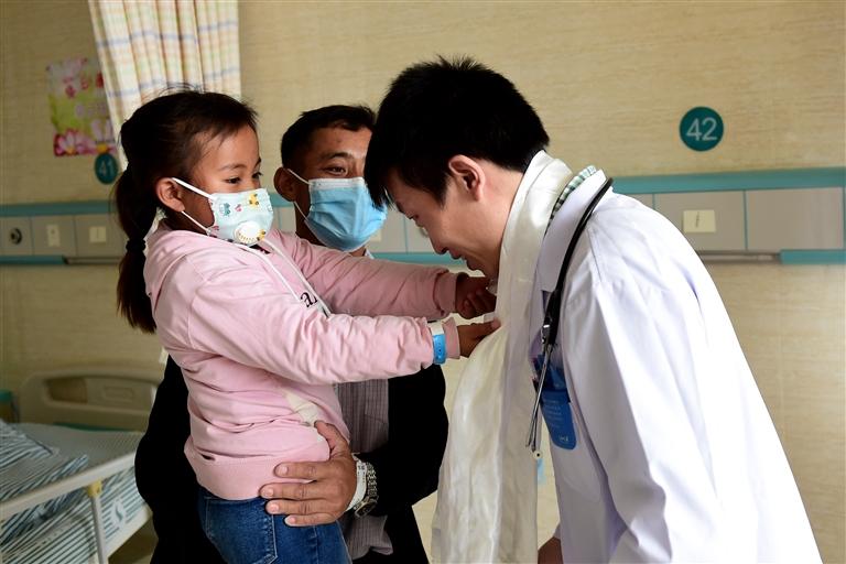 患兒(左一)在家長(zhǎng)陪同下向主治醫(yī)師車轟獻(xiàn)哈達(dá)表示感謝。黃博涵 攝