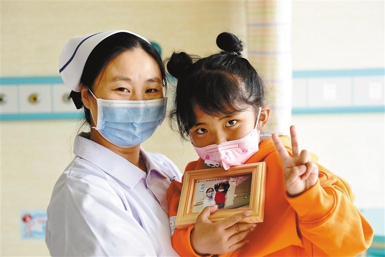 患兒(右)在出院前和護(hù)士長(zhǎng)馬寒香合影。黃博涵 攝
