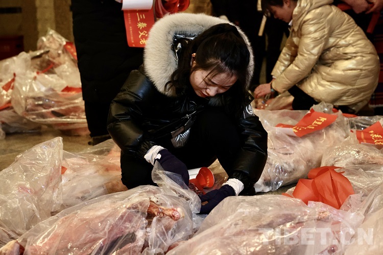 圖為工作人員將物資打包,準(zhǔn)備裝車 攝影:普索朗