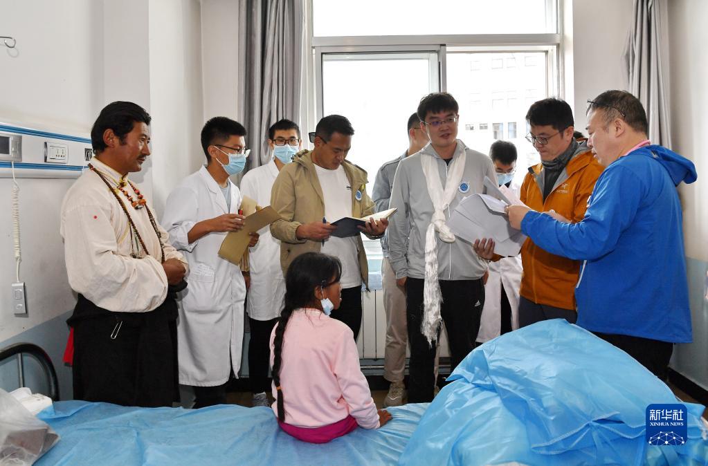 7月29日,在阿里地區(qū)人民醫(yī)院,醫(yī)生們?yōu)榇诫窳鸦颊邥?huì)診。新華社記者 張汝鋒 攝