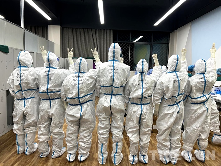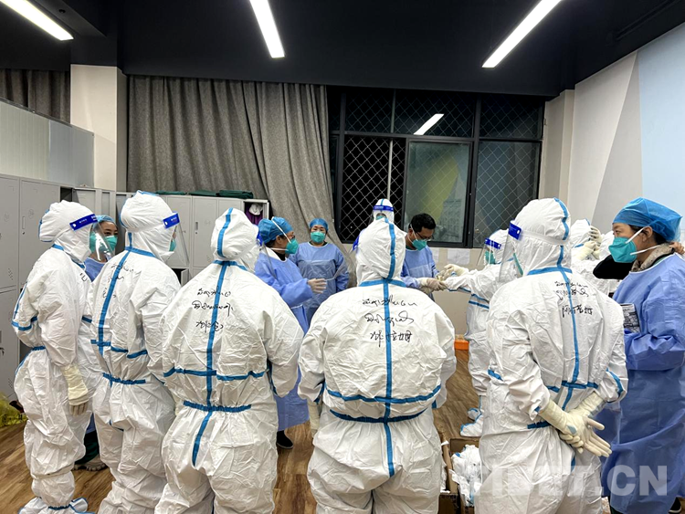 圖為拉薩市第二座方艙醫(yī)院醫(yī)護人員們正在穿防護服準(zhǔn)備開始一天的工作 攝影:次仁卓瑪