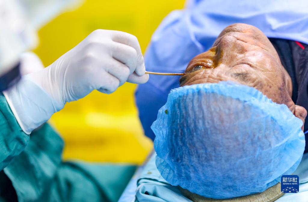 6月8日,光明眼科康復診療院的醫(yī)生在為一位農牧民白內障患者做術前準備。新華社記者 姜帆 攝