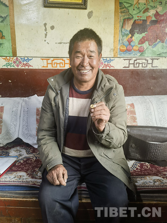 索杰醫(yī)生取出第三個(gè)包的時(shí)候,格外小心翼翼。我們因此也就更好奇,里面又是什么“寶藏”?!拔?986年入黨,1997年當(dāng)村大隊(duì)的副隊(duì)長(zhǎng)。2010年,鄉(xiāng)里在12個(gè)村的大隊(duì)長(zhǎng)中,選兩名優(yōu)秀人員,我就是其中之一?!彼鹘茚t(yī)生邊說(shuō),邊慢慢拿出一個(gè)盒子,打開(kāi)盒蓋,把手在衣服角上抹抹,然后取出一枚金黃閃亮的毛主席像章?!爱?dāng)時(shí)我們縣一共去了20人,先到那曲市委黨校學(xué)習(xí)了8天,然后到北京和大連分別參觀學(xué)習(xí)7天。在北京,我去了毛主席紀(jì)念堂、天安門(mén)、長(zhǎng)城、鳥(niǎo)巢、水立方。我在天安門(mén)廣場(chǎng)買(mǎi)了鮮花,到毛主席紀(jì)念堂門(mén)口時(shí),先是有點(diǎn)緊張,因?yàn)槟抢镎緧彽能娙?。我把鮮花放在一個(gè)統(tǒng)一的地方,瞻仰毛主席遺容時(shí),我緊張的心情一下子沒(méi)有了,都變成了激動(dòng)?!彼鹘茚t(yī)生把手放在心臟的位置比劃著,“為了紀(jì)念毛主席,我就買(mǎi)了一枚毛主席像章?!?/p>