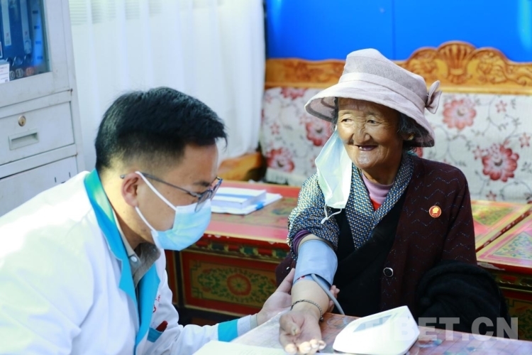 圖為亞東縣中心醫(yī)院醫(yī)護人員為老人測量血壓 圖源:帕里鎮(zhèn)四社區(qū)工作隊