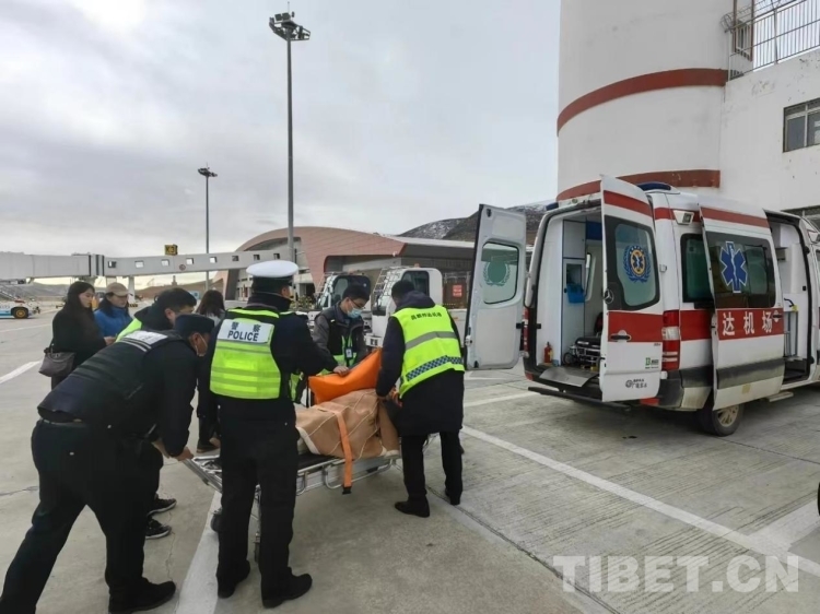 圖為隨車的邦達(dá)機(jī)場(chǎng)工作人員與昌都市人民醫(yī)院醫(yī)護(hù)人員完成交接
