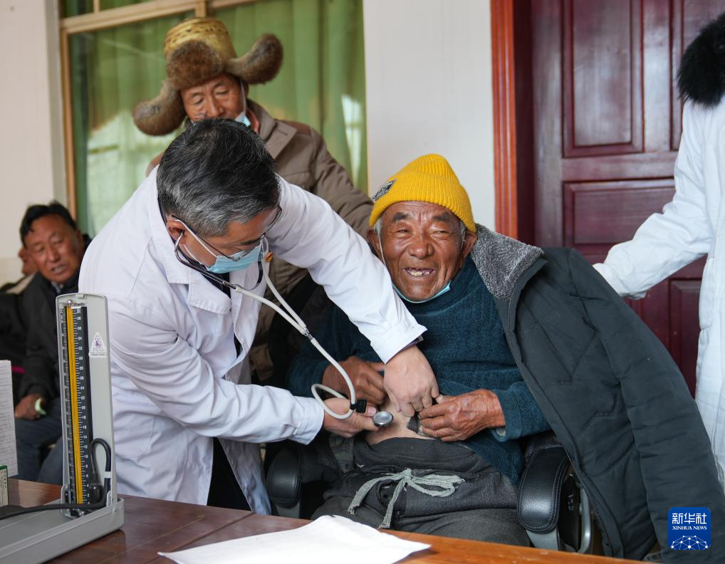1月24日,西藏大學醫(yī)學院熊海教授給患者檢查身體。新華社記者 晉美多吉 攝