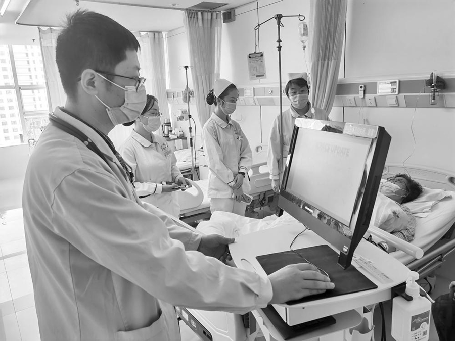 西寧市第一醫(yī)療集團(tuán)總院醫(yī)生運(yùn)用移動工作站為患者服務(wù)。