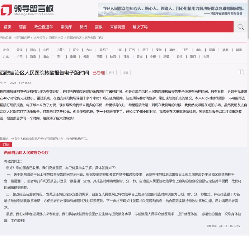 收到留言后,西藏自治區(qū)人民政府辦公廳高度重視,立即與西藏自治區(qū)衛(wèi)健委了解核實,向這位網(wǎng)民致以歉意,并作了詳細(xì)答復(fù):