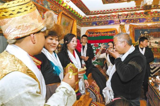 游客們在拉薩市城關(guān)區(qū)奪底街道維巴村體驗藏歷新年的別樣風(fēng)俗。記者 格桑倫珠 唐斌 攝