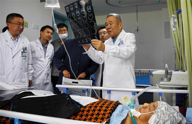 配圖:中國科學(xué)院院士、首都醫(yī)科大學(xué)附屬北京天壇醫(yī)院神經(jīng)外科學(xué)中心主任醫(yī)師趙繼宗(后右一)在自治區(qū)第二人民醫(yī)院為患者會診。 新華社記者 張汝鋒 攝