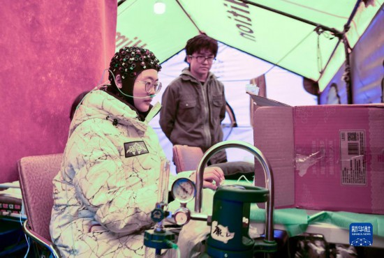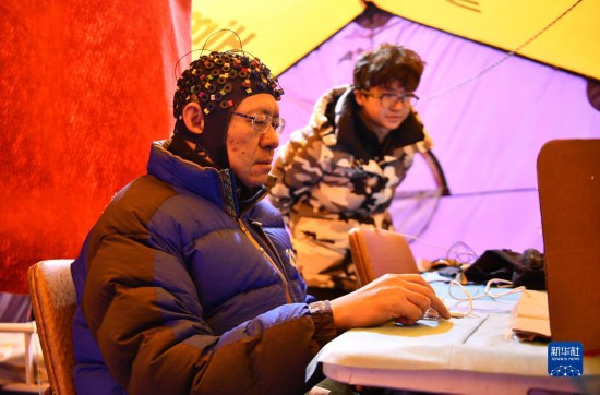 在卓奧友峰登山大本營,中科院院士朱彤佩戴全腦彈性測試帽,測試人體認(rèn)知能力(10月1日攝)。新華社記者 晉美多吉 攝
