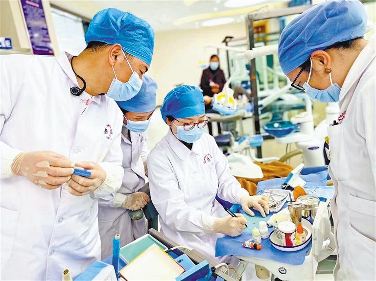 湖南援藏醫(yī)生、山南市藏醫(yī)醫(yī)院口腔科副主任醫(yī)師徐麗(中)圍繞橡皮障隔離術進行實操帶教。記者 劉楓 攝
