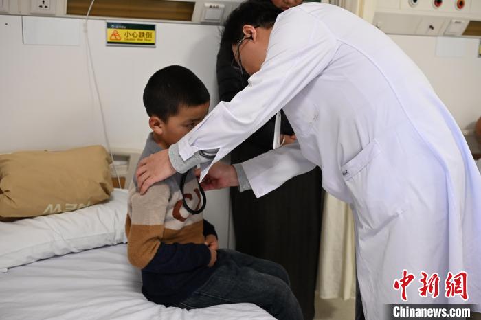 圖為北京協(xié)和醫(yī)院心外科副主任、副主任醫(yī)師張超紀(jì)為患兒尼瑪(化名)初步檢查身體情況?!≈行律缬浾?徐雪瑩 攝