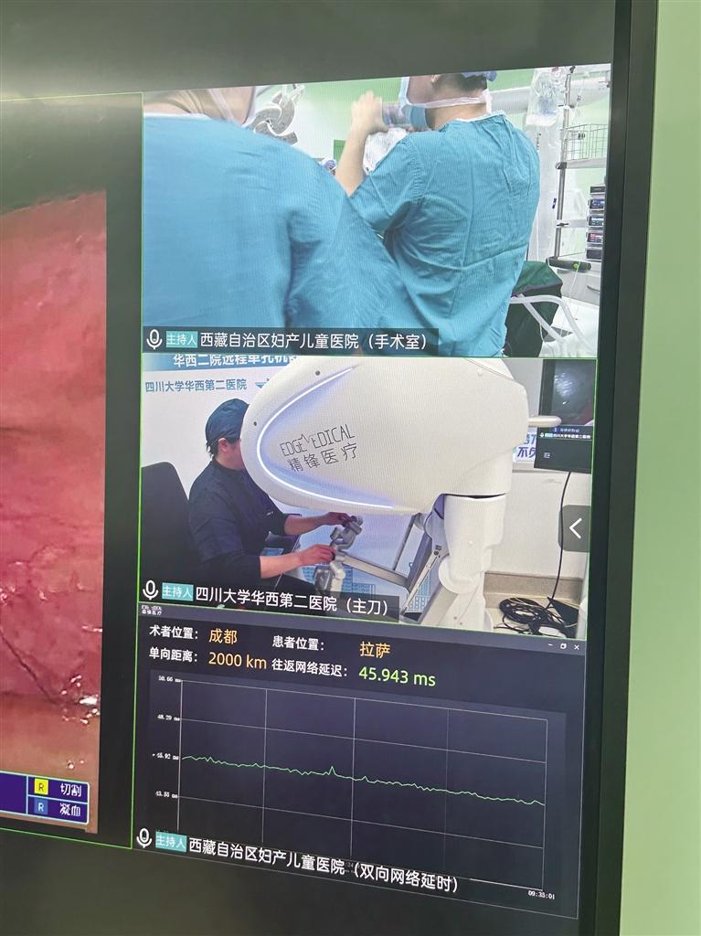 梅玲介紹,此次手術(shù)是與四川大學(xué)華西第二醫(yī)院聯(lián)合開展的,由四川大學(xué)華西第二醫(yī)院的鄭瑩教授團(tuán)隊(duì)主刀,并依托華西的先進(jìn)技術(shù)平臺(tái),通過遠(yuǎn)程方式完成手術(shù)。手術(shù)結(jié)束后,鄭瑩教授通過視頻向大家介紹,這場跨越2000公里距離與3000米海拔差異的手術(shù),總共用時(shí)1小時(shí)45分鐘,網(wǎng)絡(luò)延遲僅40毫秒。“此次手術(shù)的成功為今后更多優(yōu)質(zhì)資源技術(shù)送達(dá)偏遠(yuǎn)地區(qū)提供了重要參考,也為提高西藏醫(yī)療水平打下了堅(jiān)實(shí)的基礎(chǔ)?!编崿撜f。