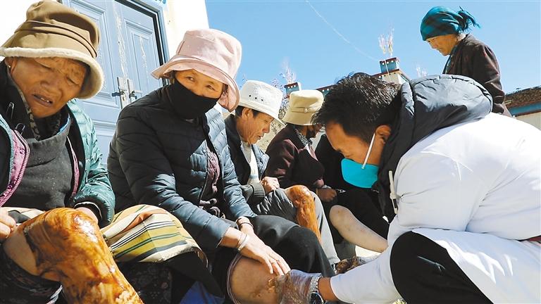 圖為措美縣家庭醫(yī)生服務團隊的醫(yī)生上門為老年人體檢并涂抹緩解關節(jié)疼痛的藥膏。通訊員 王利軍 攝