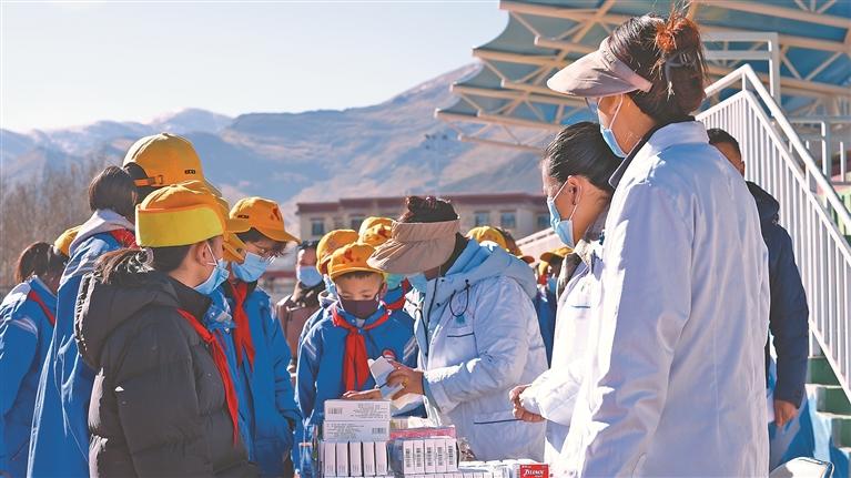 圖為巡診醫(yī)療隊隊員為墨竹工卡縣南京實驗小學學生講解流感預防知識。記者 格桑倫珠 攝