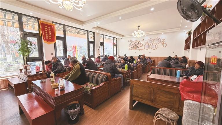 老人們正在社區(qū)驛站喝茶、聊天。圖/記者 余書冉