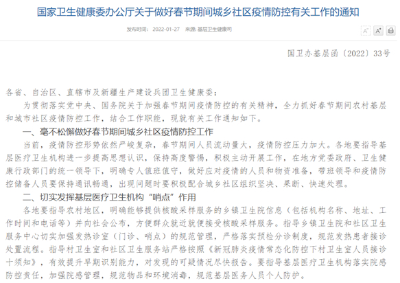 《通知》提到,各地要指導(dǎo)基層醫(yī)療衛(wèi)生機(jī)構(gòu)進(jìn)一步提高思想認(rèn)識(shí),保持高度警惕,積極主動(dòng)開展工作,在地方黨委政府、衛(wèi)生健康行政部門的統(tǒng)一領(lǐng)導(dǎo)下,毫不松懈做好春節(jié)期間城鄉(xiāng)社區(qū)疫情防控工作。