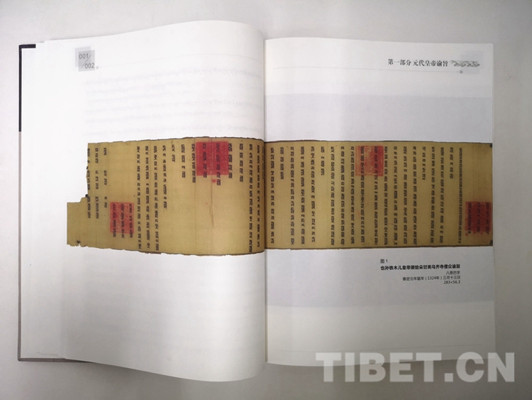 圖為《西藏自治區(qū)檔案館館藏蒙滿(mǎn)文檔案精選①》中的八思巴字《也孫鐵木兒皇帝頒給朵甘類(lèi)烏齊寺僧眾諭旨》。攝影:李元梅