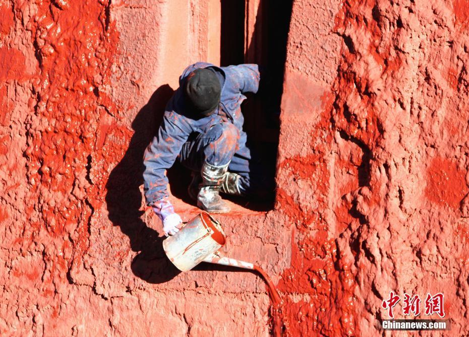 布達拉宮管理處維修科工作人員開始對紅宮進行粉刷。中新社記者 趙延 攝