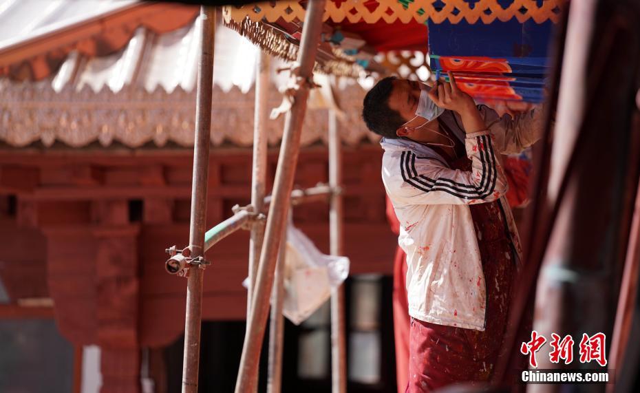 圖為強(qiáng)巴寺的僧人在刷新房屋。中新社記者 蘇丹 攝