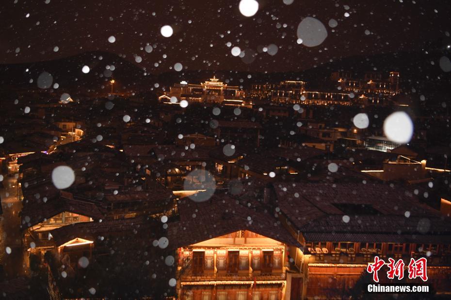 11月22日,正值中國二十四節(jié)氣中的“小雪”節(jié)氣,云南香格里拉市迎來降雪,夜色中的獨(dú)克宗古城美如畫。中新社記者 劉冉陽 攝