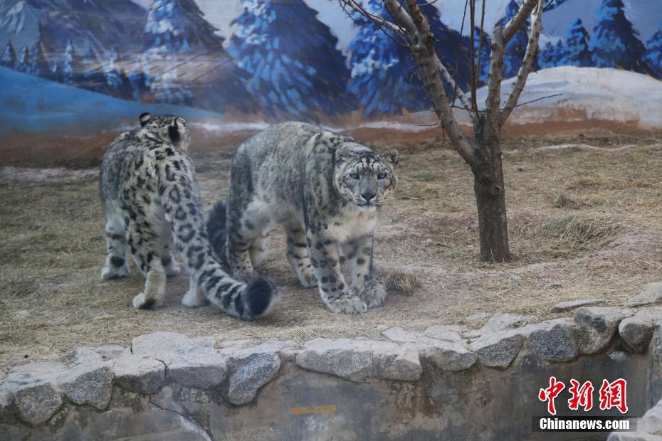 3月13日,青藏高原野生動物園雪豹館內(nèi),“傲雪”(左)陪伴21歲的“大豹”(右)散步。中新社記者 馬銘言 攝