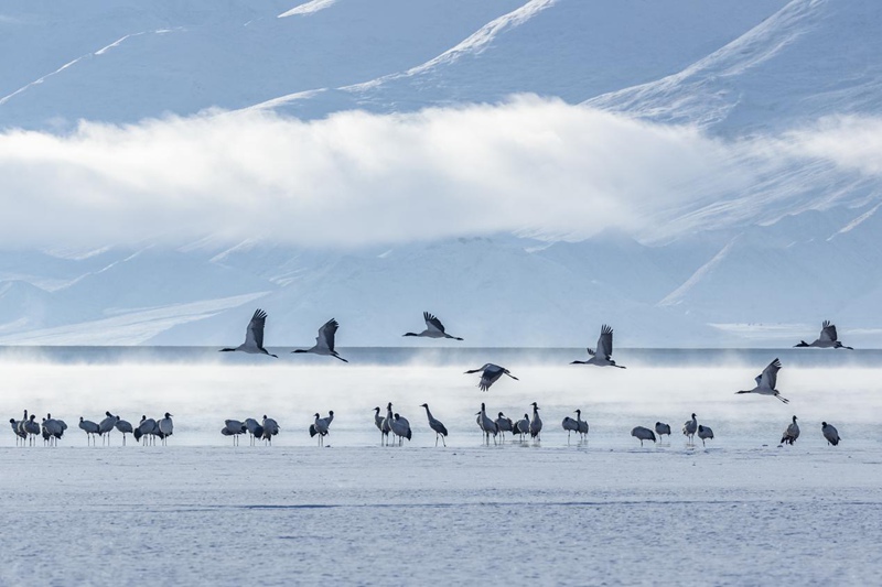 見過(guò)銀裝素裹的拉薩,但你一定沒見過(guò)在漫天白雪中盡情飛舞的黑頸鶴。茫茫天地間,優(yōu)雅的黑頸鶴沐浴著陽(yáng)光,直沖云霄。時(shí)值3月,在拉薩林周悠閑越過(guò)一冬的黑頸鶴,即將北上,開始新一季的遷徙。這春雪,仿佛就是送給它的離別禮物。