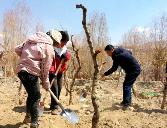 圖為拉薩市曲水縣才納鄉(xiāng)納木村村民正在房前屋后種植樹苗。