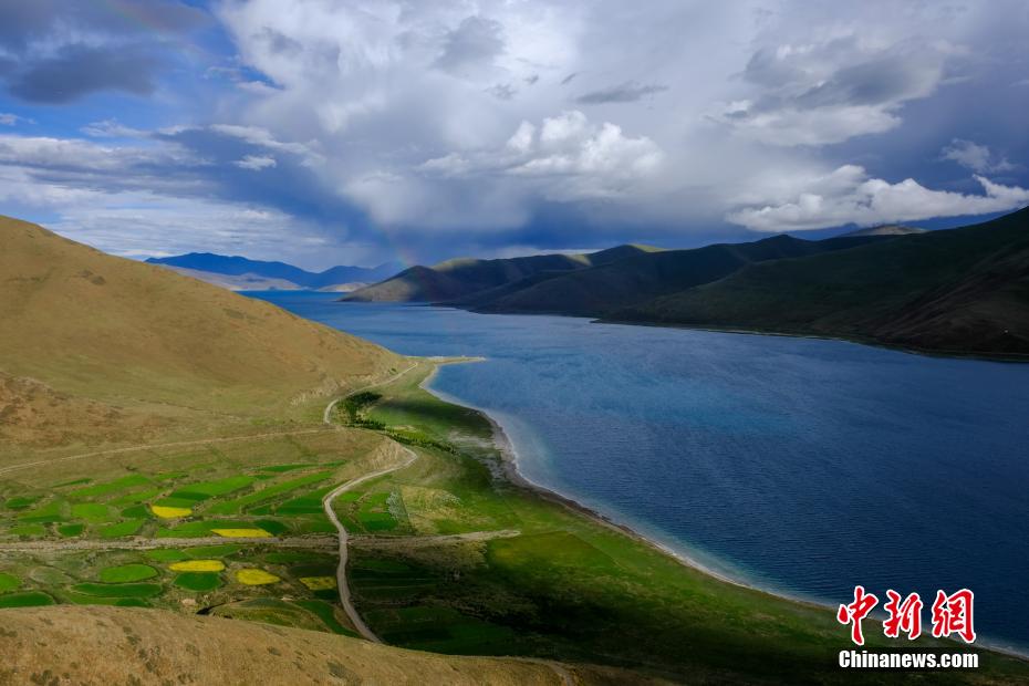 西藏自治區(qū)山南市羊卓雍錯(cuò)藏語意為“碧玉湖”,湖面海拔4441米,是西藏三大“圣湖”之一。目前正值夏季,羊卓雍錯(cuò)四周一片翠綠,其間點(diǎn)綴著盛開的油菜花。近日,記者途徑羊卓雍錯(cuò)時(shí)恰遇彩虹出現(xiàn),湖面一片翠藍(lán),風(fēng)光絕美。江飛波 攝