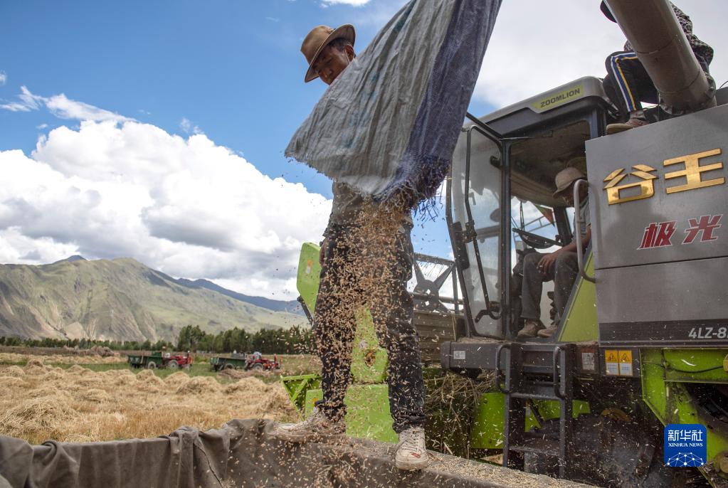 拉薩市達(dá)孜區(qū)克日村的農(nóng)民用農(nóng)業(yè)機(jī)械收割青稞(9月6日攝)。新華社記者 孫瑞博 攝