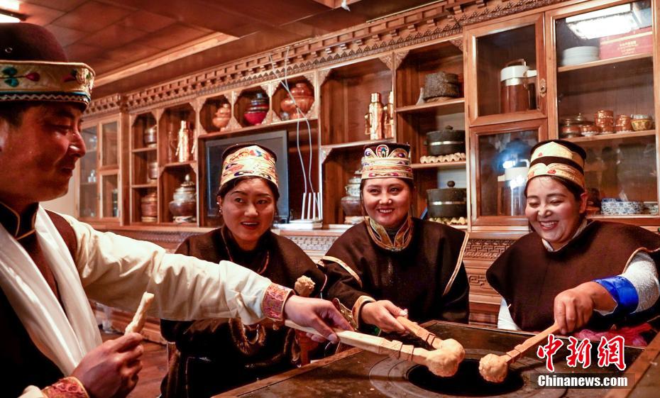 11月24日恰逢藏歷十月初一,西藏林芝迎來2023年工布新年,這是西藏最早的新年。工布新年以其悠久的歷史、鮮明的特色、豐富的內(nèi)涵,于2006年被列入第一批西藏自治區(qū)非物質(zhì)文化遺產(chǎn)保護(hù)名錄。圖為人們?cè)诨鹕峡竟?jié)日美食“結(jié)達(dá)”。 阿仁 攝