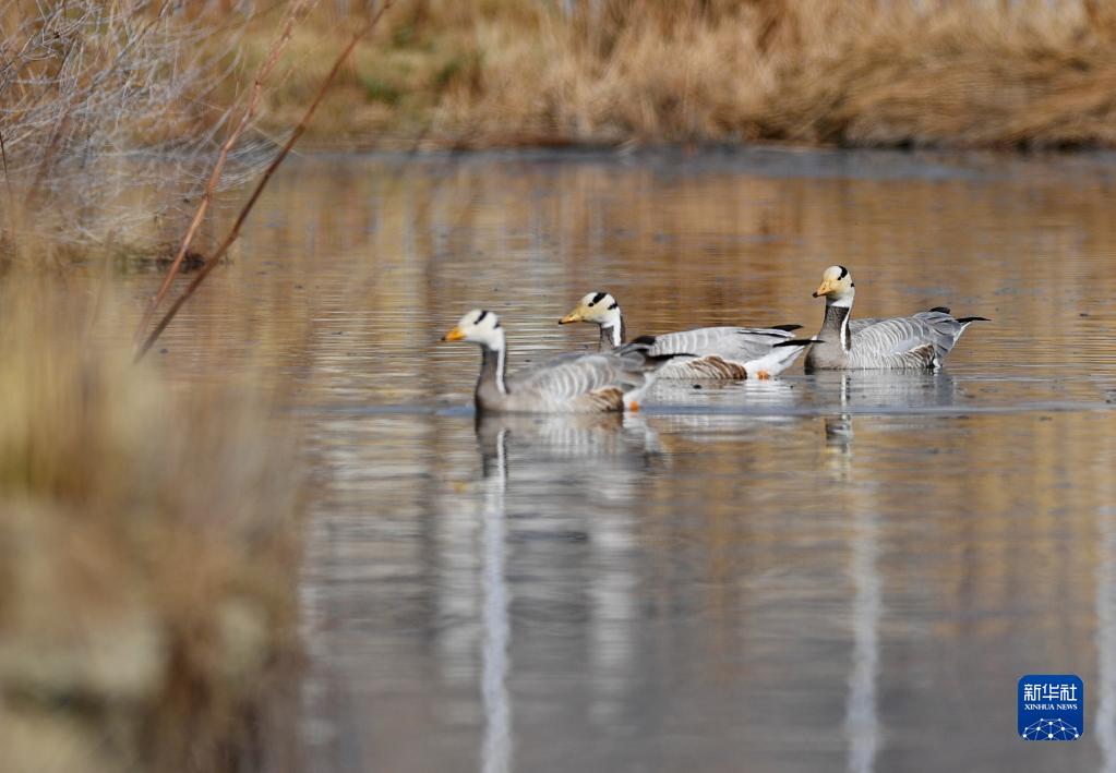 斑頭雁在拉魯濕地游弋(3月30日攝)。新華社記者 張汝鋒 攝