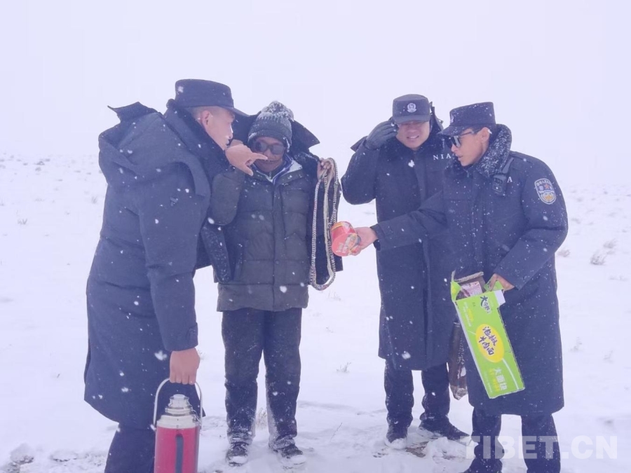 圖為嘎色和同事在風(fēng)雪中給群眾送去熱水和食物