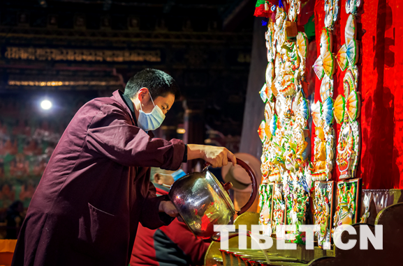 拉薩的正月十五也是格外熱鬧,大昭寺迎來(lái)了一年一度的“覺(jué)阿卻巴”即“十五祭祀”。當(dāng)日,大昭寺千佛廊內(nèi)展出5座精雕細(xì)琢的酥油花雕塑,供信眾朝拜、祈福。