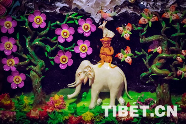 據(jù)了解,酥油花主要以佛祖神仙、菩薩金剛、飛禽走獸、花鳥魚蟲、山林樹木、花卉盆景等為主要內(nèi)容,形象逼真、色彩豐富,具有很高的藝術(shù)水平和獨(dú)特的藝術(shù)魅力。在藏歷新年期間,藏族家家戶戶都將會(huì)把酥油花插在盛滿炒麥粒和糌粑的彩色切瑪盒里,象征著人壽年豐、吉祥如意。