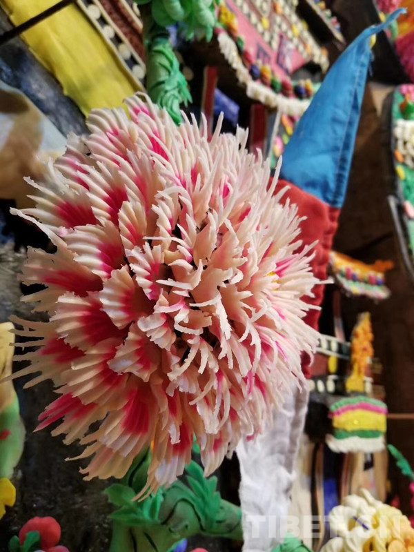 還有一種關(guān)于油酥花的傳說也與文成公主有關(guān)。佛祖前供花是佛教徒表達(dá)自己虔誠信仰的一種形式,但古時藏地氣候高寒,不適宜繁花生長。因此,信教群眾為了表達(dá)對文成公主的愛戴以及對佛祖的敬意,紛紛供奉酥油,由藝僧制作成酥油花。圖為卓尼縣酥油花。