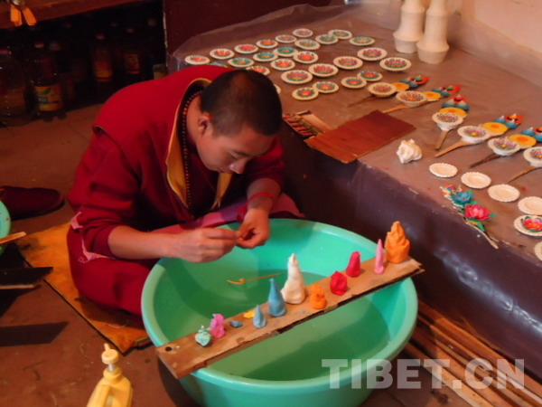酥油花巧奪天工絢爛奪目,但制作起來卻是相當(dāng)困難。僧人們將信教群眾們供奉的純凈白酥油揉進(jìn)各種有色礦物顏料,制成胚料。然后在寒冷的房屋中“扎骨架”。為防止制作中藝僧手上的溫度將酥油融化,僧人們要時不時將手插進(jìn)刺骨的雪水中降溫。圖為僧人制作酥油花,圖片來自青海省政府門戶網(wǎng)。