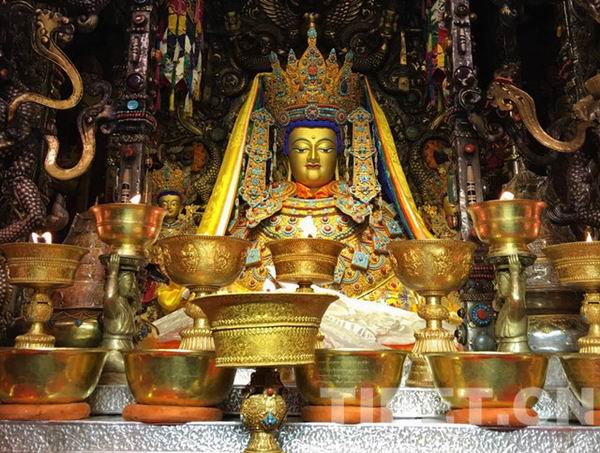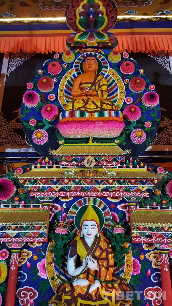酥油花是雕塑藝術(shù)的一種特殊形式。相傳,文成公主進(jìn)藏時帶去的釋迦牟尼佛像起初并沒有佛冠。宗喀巴大師學(xué)佛成功后,在佛像頭上獻(xiàn)上了蓮花形的護(hù)法佛冠,還供奉了一束“酥油花”,這就是酥油花最早的來歷。至今,宗喀巴大師的誕生地塔爾寺每年到藏歷正月十五還會展出酥油花。圖為大昭寺釋迦牟尼像。