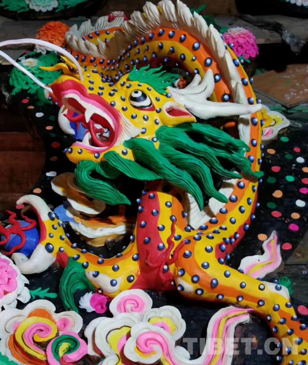 在眾多形象生動的造像中,龍的形象尤為引人注目。龍是中華文化的圖騰之一,藏地的雕刻、建筑上也不乏龍的形象。在藏族文化中,也有許多有關(guān)龍女的神話故事。圣城拉薩的布達(dá)拉宮后面就有個美麗的人工湖,名叫龍王潭。湖中有座湖心島相傳是龍女的王宮。圖為酥油花雕刻的龍。