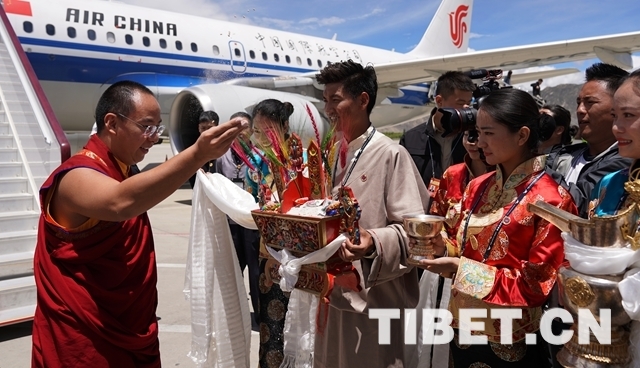 7月17日,十一世班禪乘坐的飛機抵達拉薩貢嘎機場時,西藏自治區(qū)黨委常委、統(tǒng)戰(zhàn)部部長旦科站在歡迎隊伍最前面迎接,敬獻哈達,握手致禮,表達西藏自治區(qū)黨委、政府的歡迎。